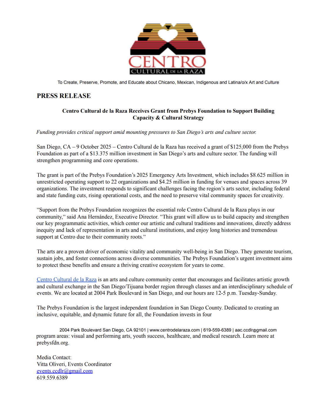Dr. Roberto D. Hernández, the Centro Cultural de la Raza’s Board President since 2021–a longtime volunteer and associate professor of Chicana/o Studies at San Diego State University–notes that the Centro Cultural de la Raza is first and foremost a community-based cultural arts center. “We here at the Centro have long held the belief that the Centro belongs to everyone. As a community space, the Centro is what we collectively make of it.